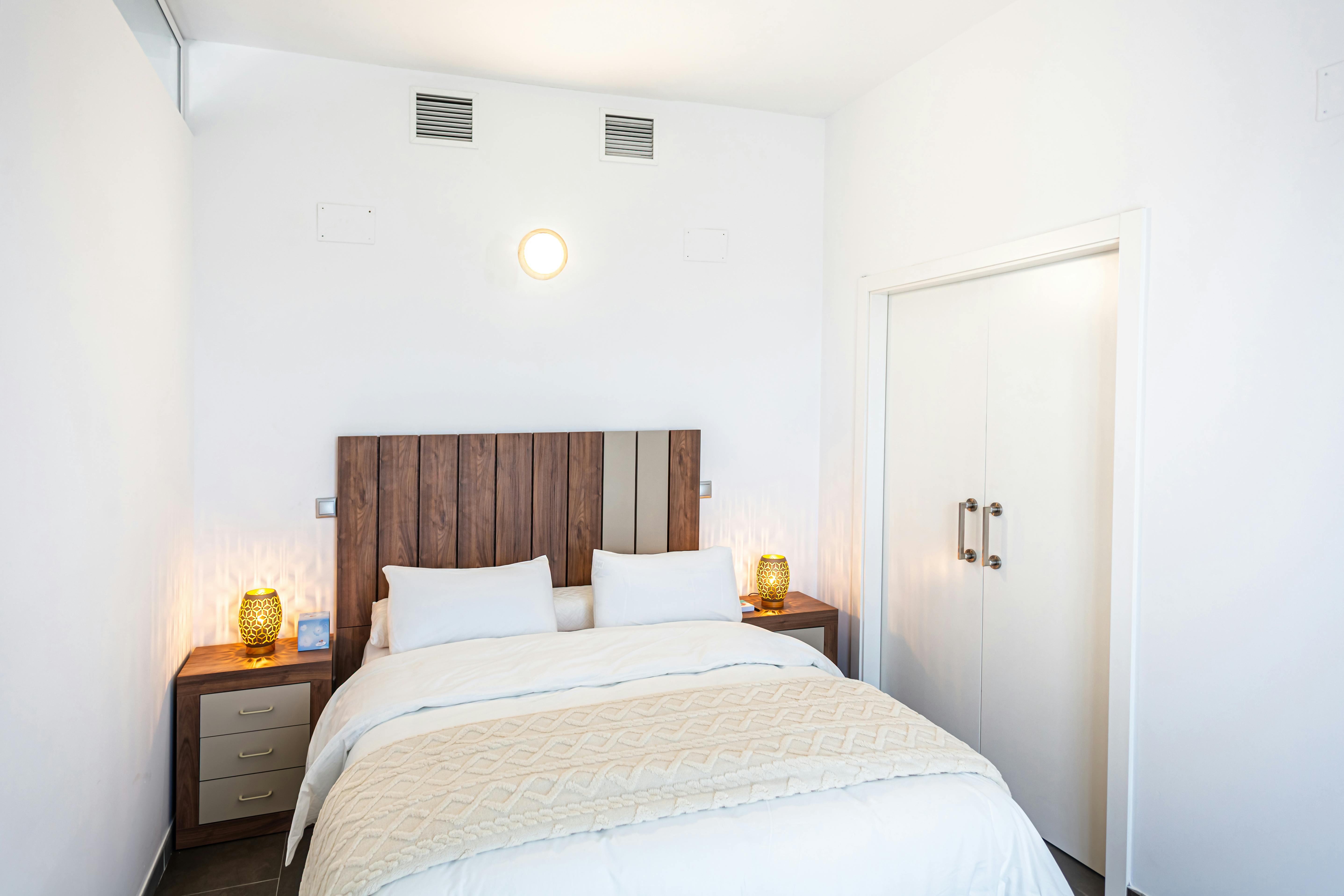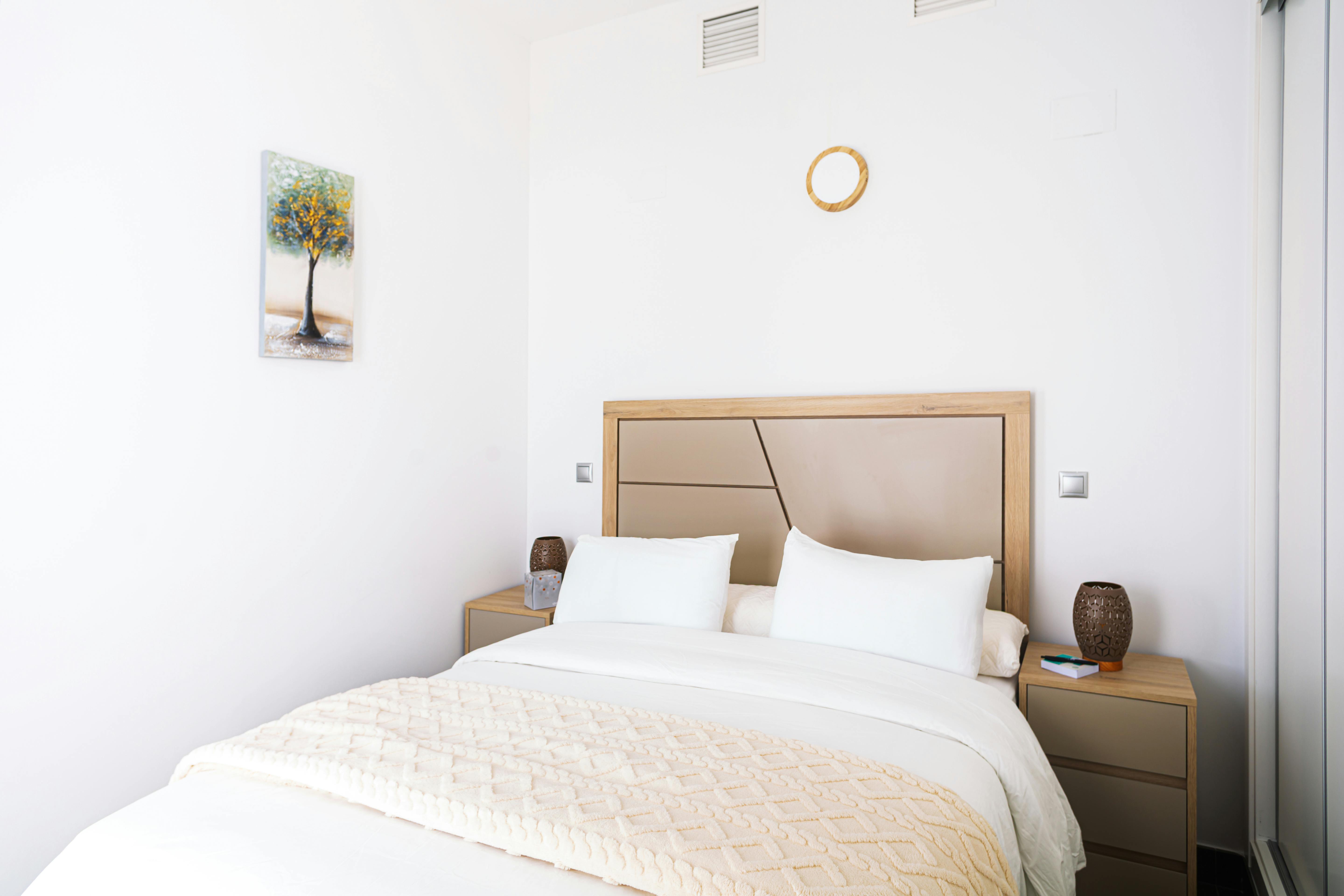 Modern and comfortable suite featuring an elegant bedroom with a queen-size bed, alongside a spacious living room with a queen-size sofa bed. The kitchen is fully equipped, with a refrigerator, kettle, capsule coffee machine, microwave, and a dining table with complete tableware. Enjoy a 55-inch Smart TV for your entertainment. The bathroom, spacious and bright, features a contemporary-style shower. Additionally, the suite boasts a sunny terrace, perfect for relaxation, furnished with a table and chairs, and offering stunning views of the landscaped areas of Gran Vía in Alicante.